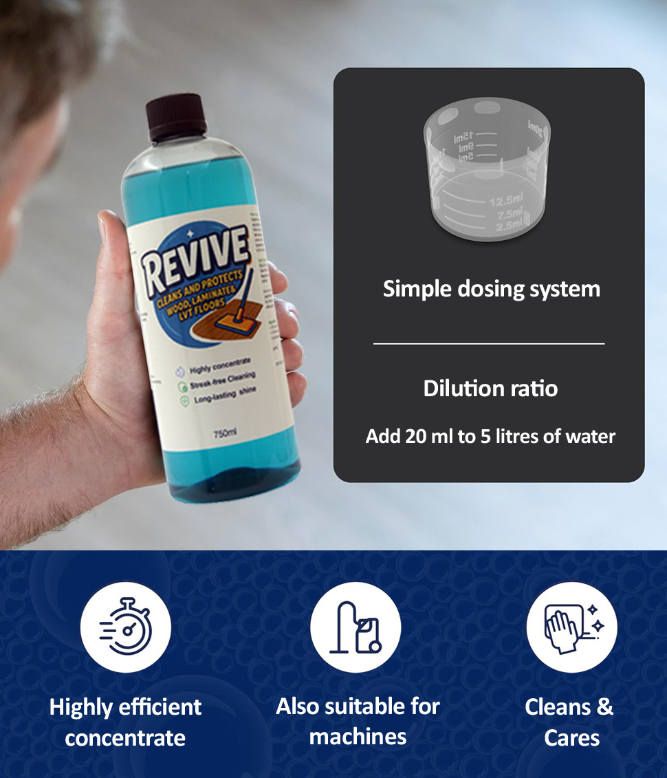 Revive floor cleaner delivers a natural, longer-lasting shine that keeps floors looking fresh and vibrant. Its enduring effect means less frequent cleaning is needed, saving time while maintaining a polished finish.